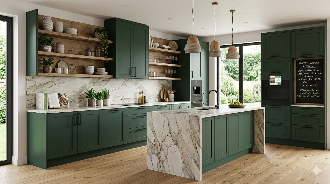 Matte green kitchen cabinets are emerging as a standout 2026 color trend, delivering luxe sophistication and personality through soft, earthy muted greens—sage, olive, moss, and forest-inspired shades with a velvety…