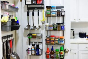 Door-mounted spice racks — Narrow racks with small hooks or clips hold spice jars vertically—great for frequent-use seasonings.