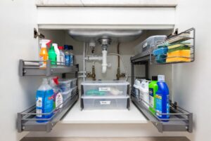 • Shallow trays — Under pipes, use flat trays for small items like dishwasher tabs.