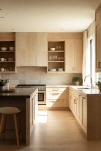 Countertops — Marble or quartz in soft veining complements the wood’s neutrality; butcher block adds extra warmth for prep zones.